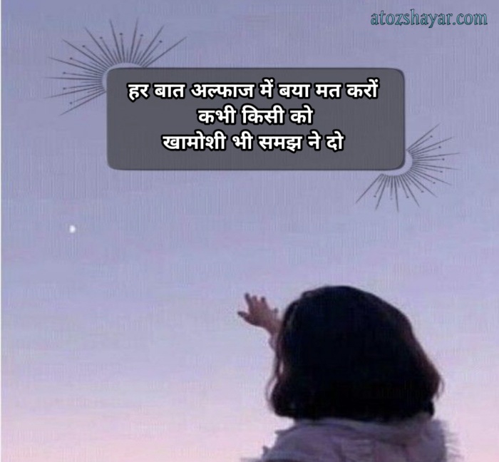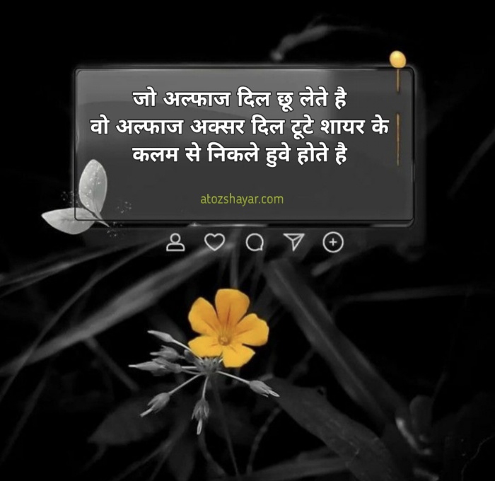 Hi everyone welcome to the atozshayar.comशायरी सिर्फ़ शब्द नहीं, यह दिल की आवाज़ होती है। हर वो आवाज चाहे मोहब्बत हो, दर्द हो, दोस्ती हो या प्रेम हो हम उसे शायरी के अंदाज में व्यक्त करना ज्यादा पसंद करते है और इस अंदाज में व्यक्त करने का अलग ही मजा आता है तो हम आपके लिए इसी तरकी कुछ alfaaz shayari in hindi लाए हैं जिसमे आपको अल्फाज शायरी इन हिंदी, लव अल्फाज शायरी, दोस्ती अल्फाज शायरी, टू लाइन अल्फाज शायरी जज़्बात अल्फाज शायरी, डीप मीनिंग अल्फाज शायरी सेड अल्फाज शायरी ये सभी प्रकार की alfaaz shayaris आपको हमारे इस ग्लॉग में देखने को मिलेंगी